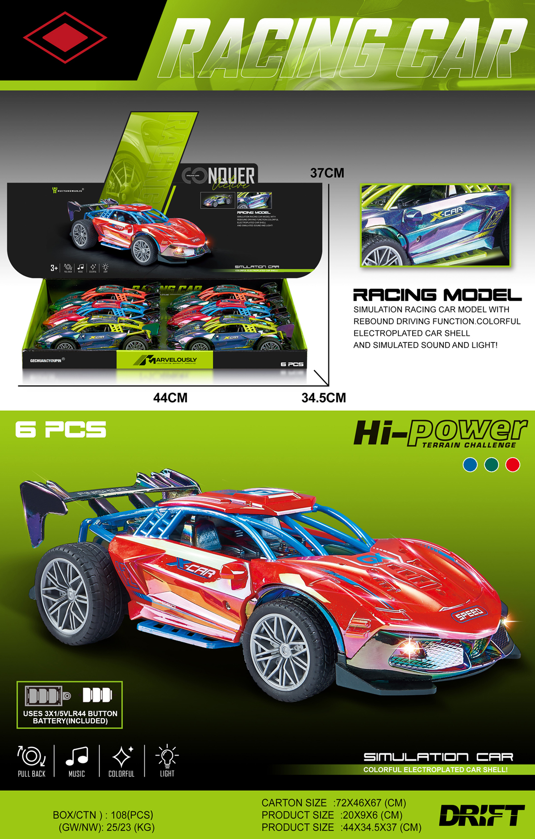 & Free ShippingEXP.6 COCHES CARRERA PULL BACK LUZ Y SONIDO,3 COL