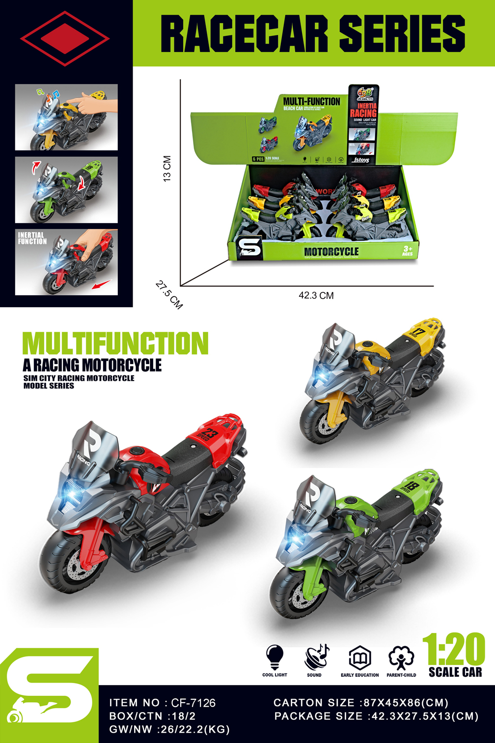 & Free ShippingEXP.6 MOTOS FRICCION LUZ Y SONIDO RACE,3 COL.
