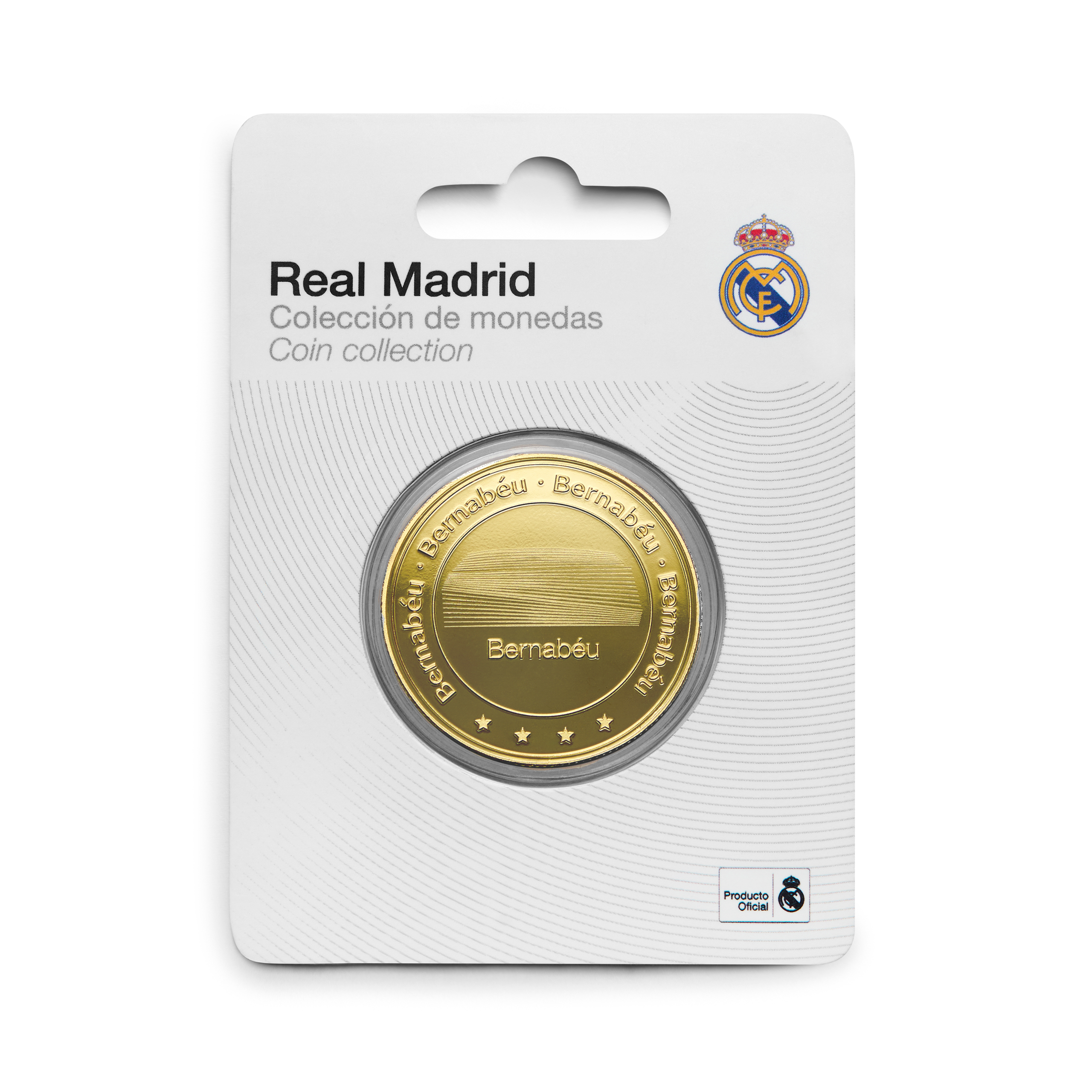Con el Estadio Bernabéu en el anverso y el escudo del Real madrid en el reverso, esta moneda de 4 cm de diámetro es una pieza de colección única e imprescindible para cualquier aficionado. Se presenta en cápsula acrílica , con tarjeta soporte del Real Madrid dentro de un estuche individual oficial.