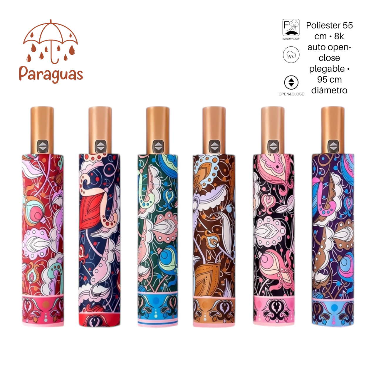 Sé el primero en valorar “PARAGUAS AUT.PLEGABLE MANGO DORADO 6 COL. ARABESCOS”