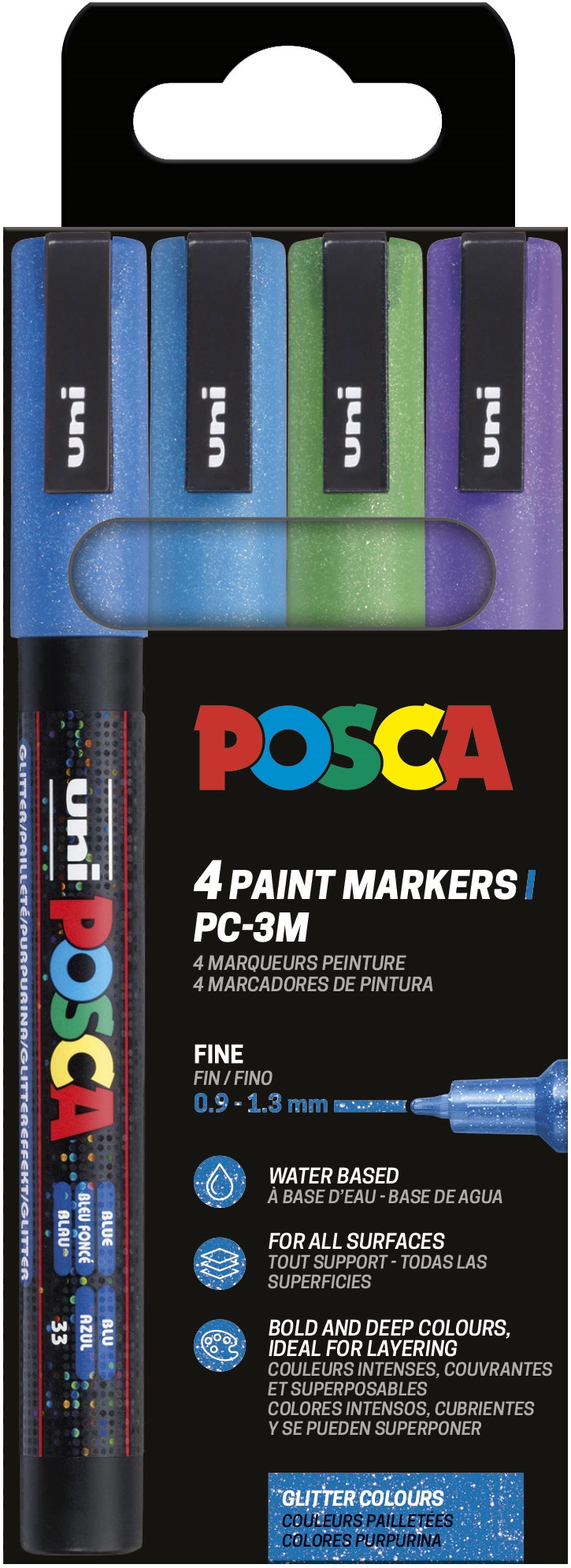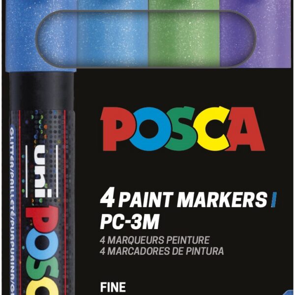 Estuche POSCA 4 colores PC-3M de 0,9 – 1,3 mm. Surtido de colores brillantes. Incluye: glitter azul, glitter verde, glitter azul claro y glitter violeta.