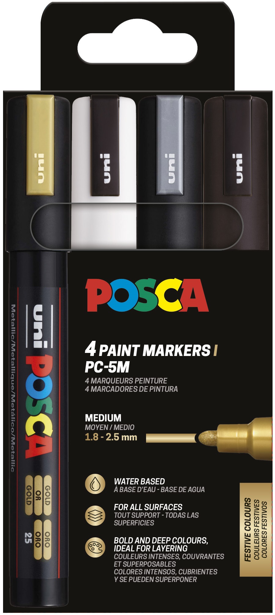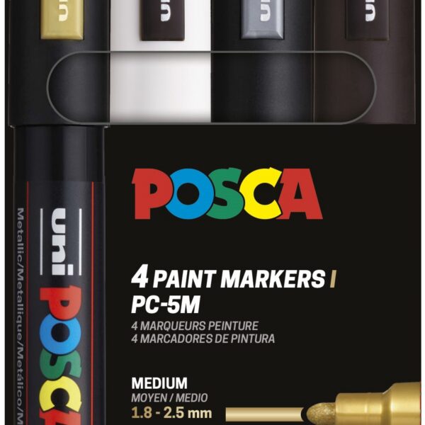 Estuche POSCA 4 colores PC-5M de 1,8 – 2,5 mm. Surtido de colores festivos. Incluye: Negro, blanco, oro y plata