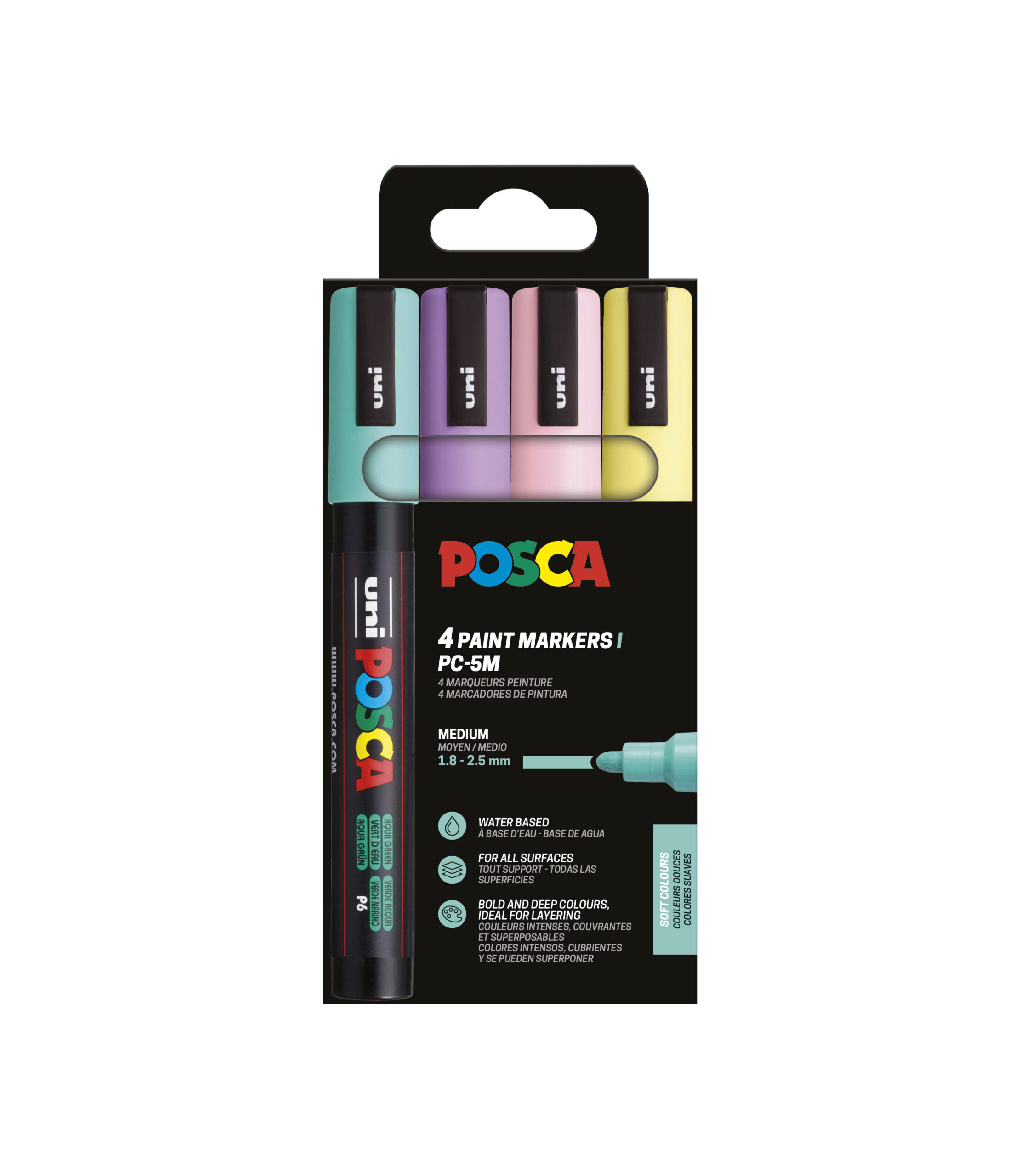 Estuche POSCA 4 colores PC-5M de 1,8 – 2,5 mm. Surtido de colores pastel. Incluye: Verde marino, lavanda, amarillo sol y rosa claro