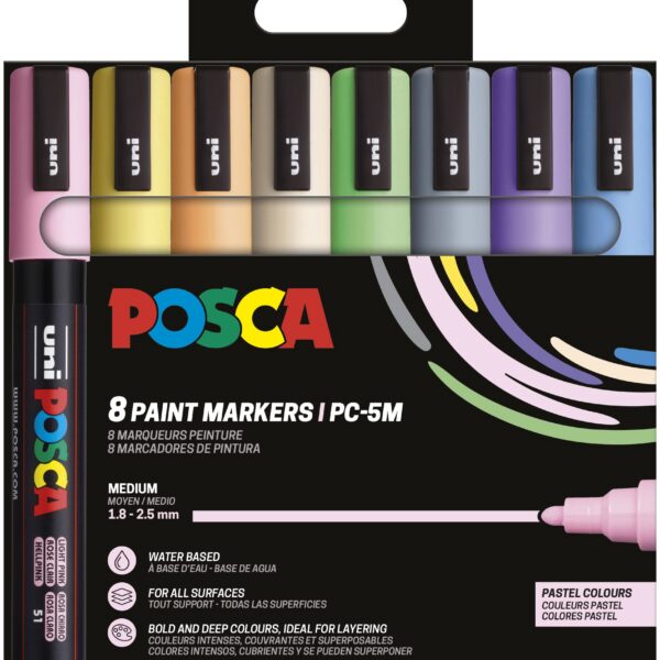 Estuche POSCA 8 colores PC-5M de 1,8 – 2,5 mm. Surtido de colores tonos pastel. Incluye: Beige, amarillo pajizo, naranja claro, rosa claro, lila, azul cielo, verde claro y gris