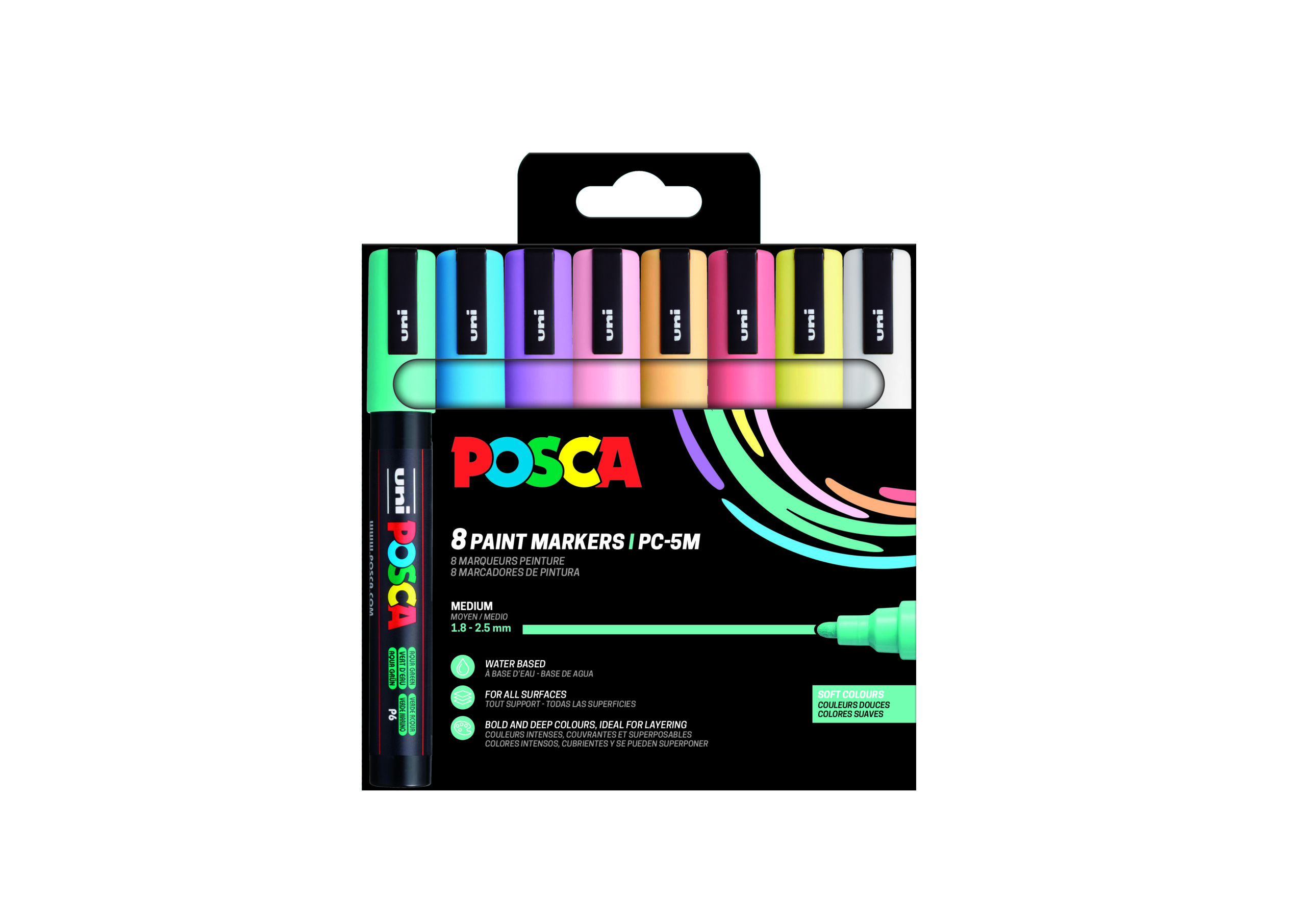 Estuche POSCA 8 colores PC-5M de 1,8 – 2,5 mm. Surtido de colores tonos pastel. Incluye: Blanco, amarillo sol, albaricoque, rosa claro, lavanda, azul claro, verde marino y rosa coral.