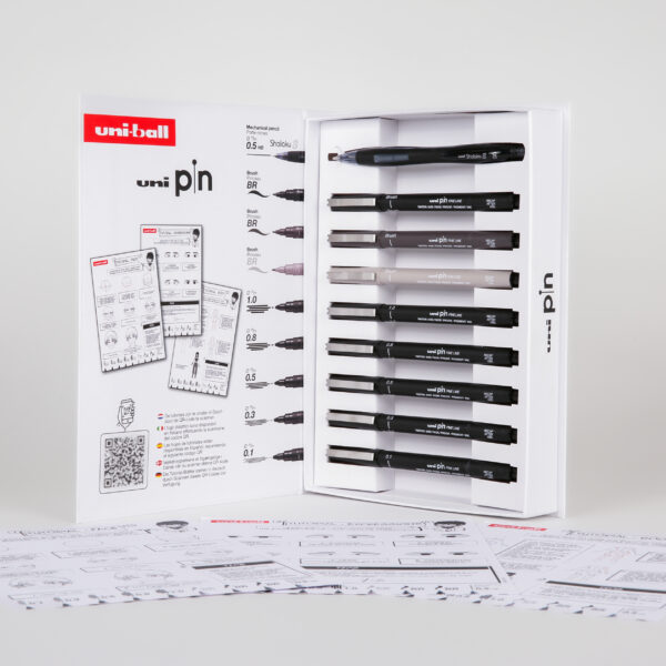 Kit de inicación al Manga que incluye lo esencial para empezar. Una selección de 8 puntas Uni Pin calibradas, un portaminas Shalaku S y 3 tutoriales paso a paso con explicaciones detalladas. Disponibles en español a través del código QR en el interior de la caja. Aprende a dibujar las caras, las expresiones y el cuerpo de tus personajes. ¡Ideal para regalo!